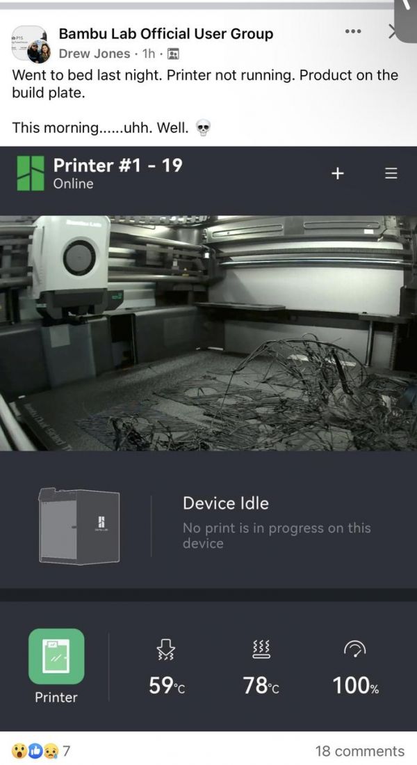 Bambu 公司的调查显示,在 8 月 15 日晚上,一个 MQTT SDK 客户端超时导致了负责远程 3D 打印任务的云端基础设施出现中断。在两次断开连接期间,连接云端的打印机排队并启动了打印任务,而主人当时都在睡觉。有些打印机在没有确认完成第一次任务的情况下,重复了打印任务,从而破坏了仍然在平台上的作品,甚至一些设备本身也出现了损坏。