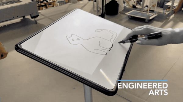 英国机器人公司Engineered Arts的人形机器人Ameca,在接入Stable Diffusion之后,可以完成一些简笔画,比如画一只猫。图片来源:Engineered Arts