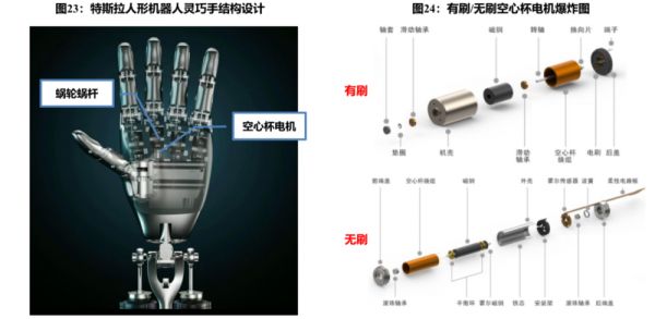 特斯拉使用空心杯电机设计的灵巧手。图片来源:东吴证券
