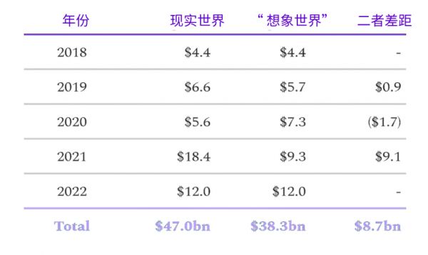 从投资总额来看,“现实世界”比“想象世界”多部署了 87 亿美元,这在很大程度上要归功于 2021 年的“异常”。而这个数字几乎相当于当地一整年的风投规模。换句话说,现实世界把本应持续 6 年的风投进程压缩成了 5 年,从而加速了很多当地公司的发展。