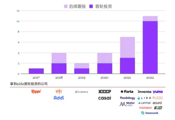 下图是 2017年~2022 年 A16Z 在拉美的投资情况。首笔投资和后续跟投均有发生,且交易数量逐年走高。值得留意的是,2022 年之前,共计完成 10 笔投资;而仅 2022 一年,就快速完成 11 笔交易。也就是说,尽管 2022 年拉美当地整体投资规模遭遇回撤,其他基金出手意愿不强,但 A16Z 仍在坚决下注。