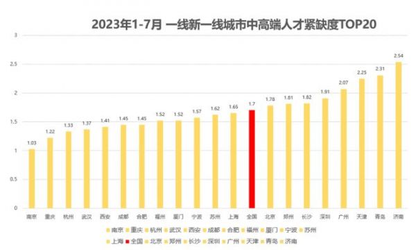 据了解,脉脉高聘人才智库将年收入30万元人民币以上的职场人定位为中高端人才,其数据显示,2023年1-7月,全国中高端人才供需比为1.7,中高端人才在整体处于饱和态势。近3年,北京市中高端人才供需比持续走高。2021年北京市中高端人才供需比为0.25,相当于4个岗位争夺1个人才。2023年1-7月,上升至1.78,相当于5个人才竞争3个岗位。