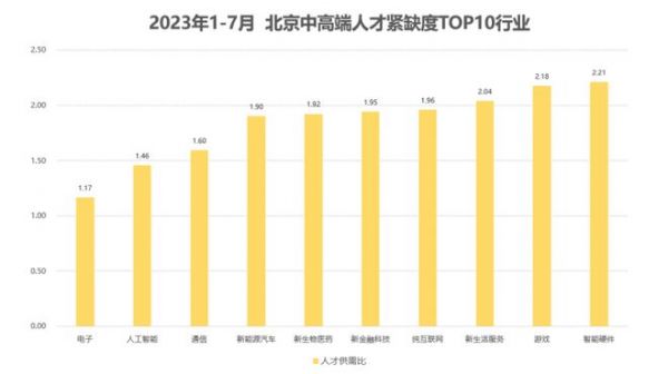8月23日消息,脉脉高聘人才智库数据显示,2023年1-7月,全国中高端人才供需比为1.7,其中,北京中高端人才供需比为1.78,人才求职竞争激烈程度略高于全国平均水平。在北京,互联网行业依然是新发中高端岗位量最多的行业,占比近3成。