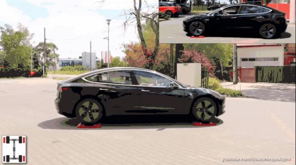 多年前外媒就对四驱版奥迪A5与Model 3做过简单的滑轮测试,在仅单轮有附着力的情况下二者都能脱困,但后者的脱困过程要轻松、利落得多。