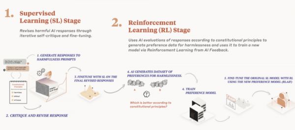 Anthropic结合自己的实践经验,并借鉴世界人权宣言、苹果公司的服务条款、DeepMind的Sparrow规则[9]等文件,提出了一套覆盖面广泛的原则清单,并以此为评估基准让其大模型Claude自己来评估自己的输出,其目标是在促进模型输出有用回答的同时,将其输出有害内容的可能性最小化。[10]