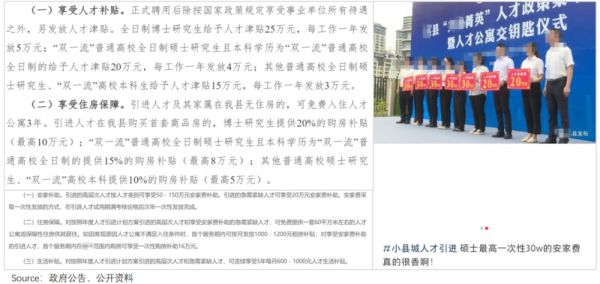 但实际上,“保姆式”面试只是县城重金求才的冰山一角。人才们真正踏进县城,基本都能获赠安家费、生活补贴,人才公寓“几件套”,部分县城的硕士安家费甚至高达30万。