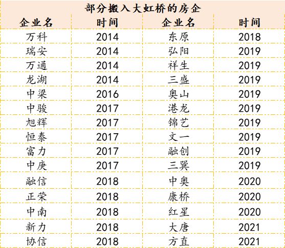 在2017年到2019年这三年期间迁入到大虹桥的房企最多,有的是原本在上海的其他板块,比如旭辉,有的则直接从外地迁入。