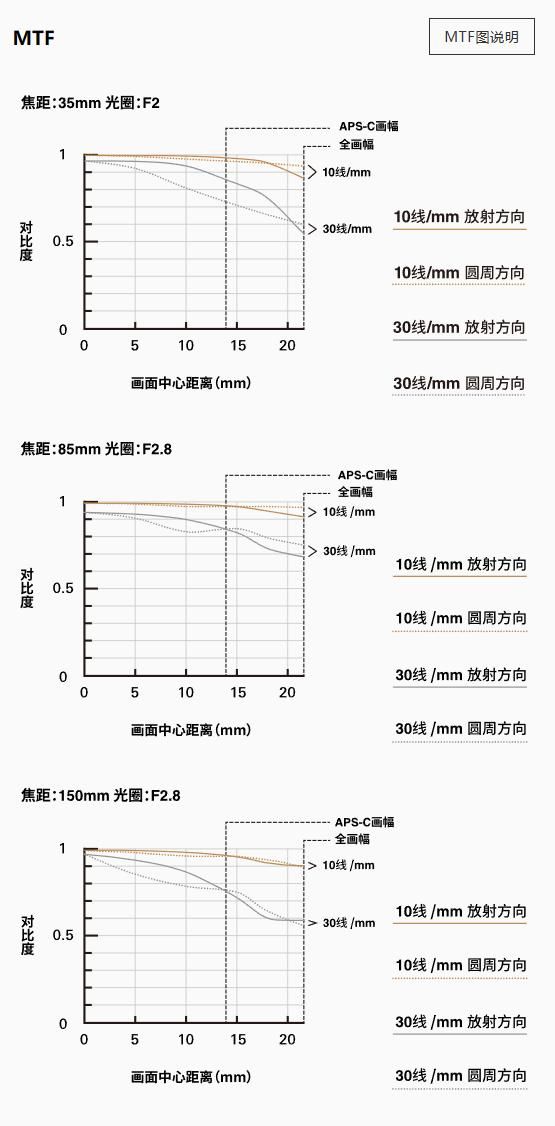MTF 曲线图中的 10 线 / mm(低周波)的曲线越接近 1,说明镜头的再现性、通透性越好。而 30 线 / mm(高周波)曲线越接近 1,则表示镜头的分辨率越好锐度高。