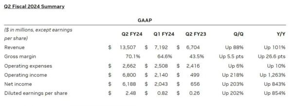 8月24日,英伟达公布了截至2023年7月30日的第二季度财报,营收达到135.1亿美元,同比增加101%,创下历史新高业绩。英伟达的净利润也达到了 61.88 亿美元,同比增长 843%。此外,英伟达的毛利率比去年同期增长了 25%,达到惊人的71.2%。