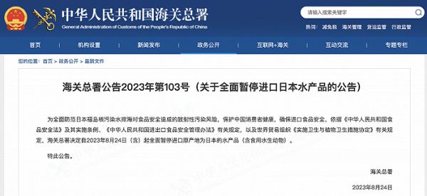 8月24日,海关总署发布公告,为全面防范日本福岛核污染水排海对食品安全造成的放射性污染风险,保护中国消费者健康,确保进口食品安全,依据《中华人民共和国食品安全法》及其实施条例、《中华人民共和国进出口食品安全管理办法》有关规定,以及世界贸易组织《实施卫生与植物卫生措施协定》有关规定,海关总署决定自2023年8月24日(含)起全面暂停进口原产地为日本的水产品(含食用水生动物)。