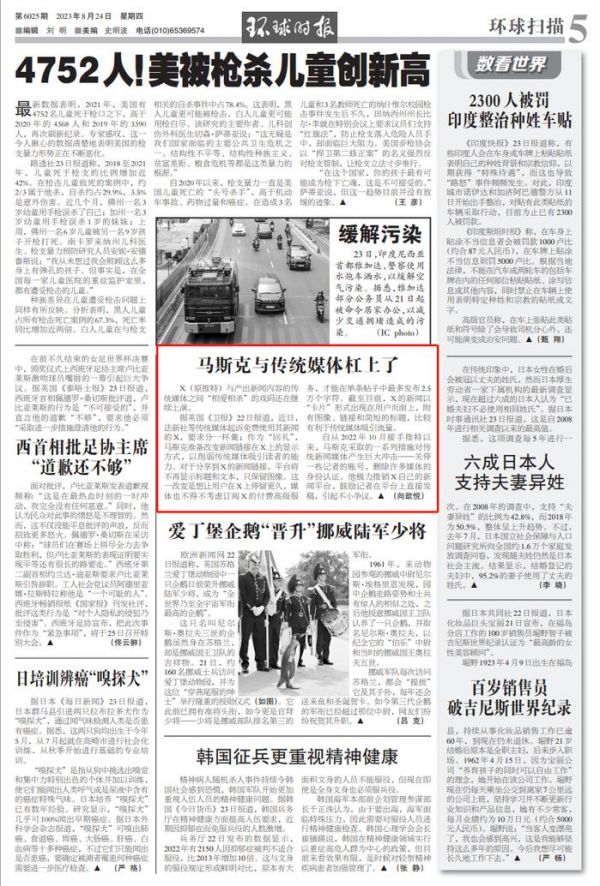 马斯克(资料图)自从2022年10月接手推特以来,马斯克采取的一系列措施对传统新闻媒体产生巨大冲击——关停一些记者的账号,删除许多媒体的身份认证。他极力推销X自己的新闻平台,鼓励记者在平台上直接发稿,引起不小争议。