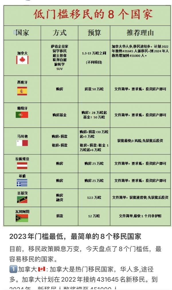 图 | 移民机构在各大平台发布的不同国家移民门槛