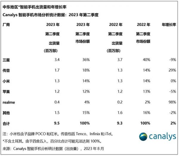 Canalys:Q2中东智能手机市场份额三星、传音、小米分列前三
