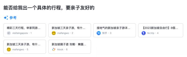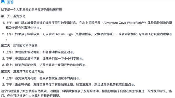 测试到这还没结束,我们进行了第二次追问,加上了“亲子友好”的限定条件。在这次追问中,我们并没有明确这个攻略要覆盖几天的行程,但天工AI搜索根据上下文的信息给出的是三天的行程攻略,顾及到了亲子友好的需求。不得不说,天工AI搜索是真的很“懂”。