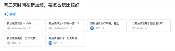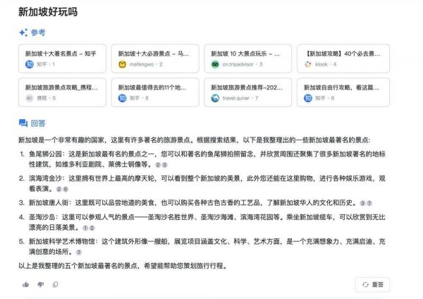 测试先从一个宽泛的问题开始,输入“新加坡好玩吗”之后,天工AI搜索开始整活:列出几个相关链接,提供了信息溯源,随后给出了一段完整的回答。