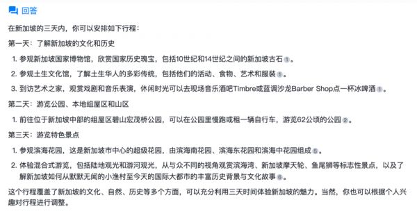 一个简单测试,已经能够看出天工AI搜索的智能升维。为了进一步测试天工AI搜索的智能程度,我们进行了追问,加了一个限定条件“三天时间”,希望得到旅行建议。