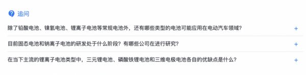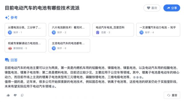 在输入了“目前电动汽车的电池有哪些技术流派”后,天工AI搜索依旧列出了6个信息溯源点,给出了经过总结和提炼的答案。这个回答不仅归纳了当前电池的主要类别,还介绍了市场主流的电池类型,以及更加前沿的电池技术。短短一段话,足以让用户对电池行业的现状有大致了解。