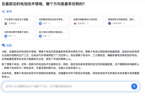 当然,既然是测试必须要加大难度,所以我们追问的是“前沿电池技术哪个最有优势”,这是一个非常考验AI搜索理解、总结信息能力的问题。而天工AI搜索没有被难倒——没有一本正经的胡说八道,天工给出了明确的回答,和充足的论据,每一个论点都有据可依。