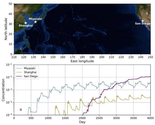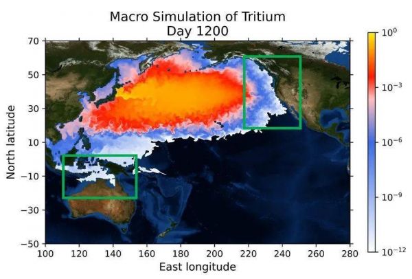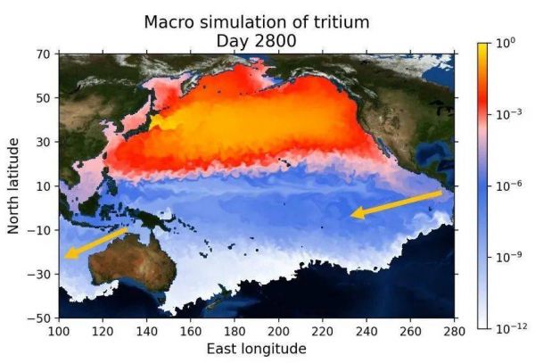 在排放后的第1200天(3.3年),污染物扩散到加拿大和美国的西侧海域,而澳大利亚的北部也出现了一部分污染物,此时几乎整个北太平洋都被污染物覆盖。