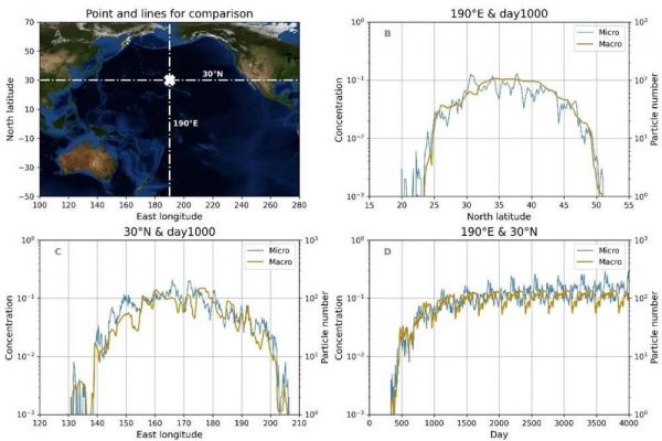 进一步,可以将整个海域划分成一系列方形小区域,然后计算一个时间步长内每个区域的污染物浓度变化(3个子过程叠加),这一计算过程不断迭代进行,就得到了指定时刻的污染物浓度分布。为了补充和验证前面的宏观扩散模拟方法,研究团队还从微观的角度(将污染物分解成大量的独立微粒)进行了核污水排放的扩散模拟,结果如下。
