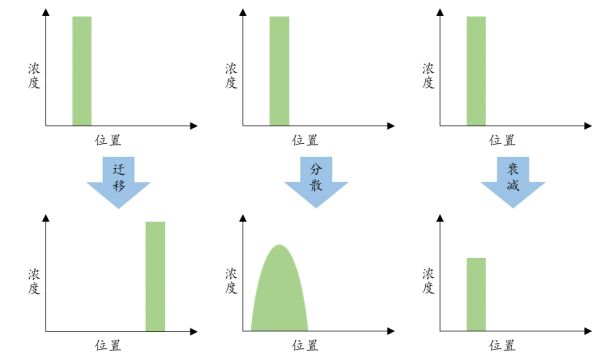 为了实现模拟,研究团队首先将放射性物质在海洋中的扩散拆解为3个近似独立的子过程,分别是迁移过程、分散过程以及衰减过程。简单地说,迁移过程是指污染物随洋流的运动,分散过程是指污染物从高浓度区向低浓度区的输送,衰减过程是指污染物由于自身的分解、衰变等转化为其它物质的过程。下面这张图形象地表示了这3个过程所引起的污染物浓度变化。