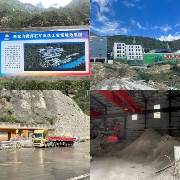 李家沟锂矿矿区 左上:公示牌 右上:修建中的厂房 左下:矿山脚下的一车原矿 右下:堆积着原矿细粉的车间 图片来源:时代财经 张汀雯/摄