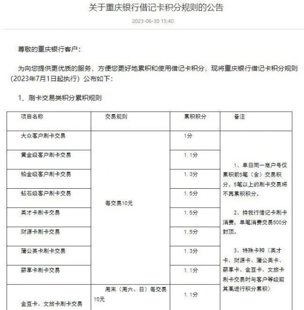 2023年7月起,该行又对借记卡规定:不足10元或超出10元的零头部分不累积积分;持借记卡单笔刷卡消费交易500分封顶;不累积银行卡积分的商户类型超过80种。