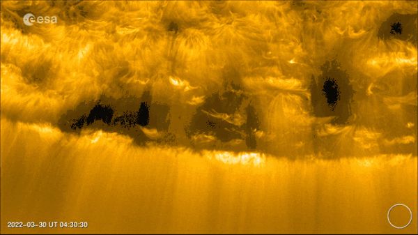 环日轨道器上的极紫外成像仪(EUI),能够提供前所未有的高分辨率、高步频图像。2022年3月30日,由EUI所拍摄的太阳南极图片,揭示了一系列微弱而短寿命的特征,这些特征与太阳大气中喷射出的小型等离子体喷流有关。