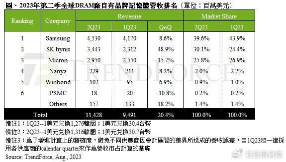 排名第四的南亚科技(Nanya)出货已连续衰退超过四个季度,二季度受到电视订单带动,营收环比增长约8.2%至2.29亿美元,市场份额为2.0%。