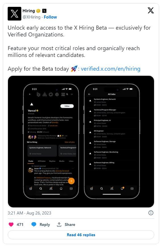 在私信中推出视频聊天、语音聊天功能之后,X 今天宣布上线 Beta 版 X Hiring 平台,希望将其打造成为比肩 LinkedIn 的招聘平台。