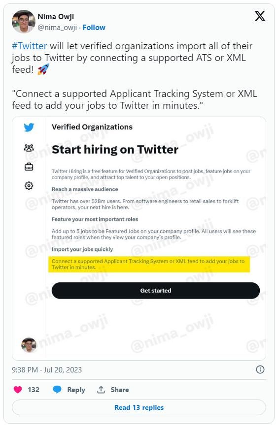 X 公司已经邀请多家企业入驻,支持 ATS 或者 XML 格式导入招聘信息,官方表示整个过程只需要几分钟就能完成,声称可以帮助企业扩大招聘面,吸引更多人才。