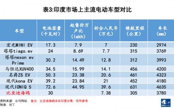 而上汽名爵在印度推出了微型车Comet车型,原型车是宏光MIN EV;另外,比亚迪的海鸥车长不到4米,如果引入印度,也将给这个细分市场带来新的变量。