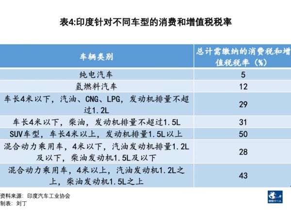 另外,印度政府对于汽车消费课以重税,对于车长4米以下的车型,根据排量不同税率为29%~31%左右,4米以上车型以及SUV车型,税率高达43%~50%。