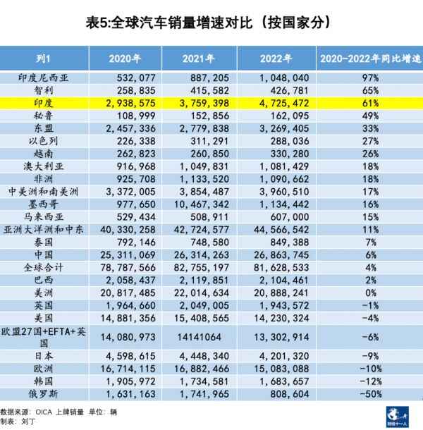 一方面,印度汽车市场确实在增长,2022年相比于2020年增长了60%,是全球百万规模以上国家市场增长最快的。