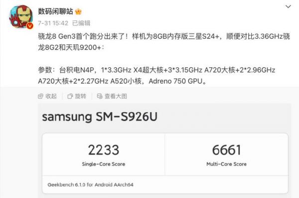 骁龙8 Gen3首个跑分出来了!样机为8GB内存版三星S24+,顺便对比3.36GHz骁龙8G2和天玑9200+: