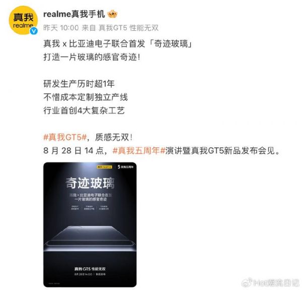真我realme将在8月28日14:00召开「越级而上」五周年演讲暨真我GT5新品发布会,将正式推出「五周年越级大作」真我GT5,为用户打造性能无双旗舰体验。在今天的新品预热中,真我官宣联合比亚迪电子首发「奇迹玻璃」,打造一片玻璃的感官奇迹!