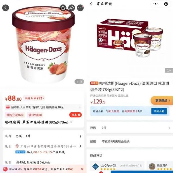 此外,山姆会员店的法国进口哈根达斯冰淇淋,两桶794克只需要129.9元,而同一产品在京东上领券之后73元一桶,如果购买三桶的话则低至69.3元一桶。