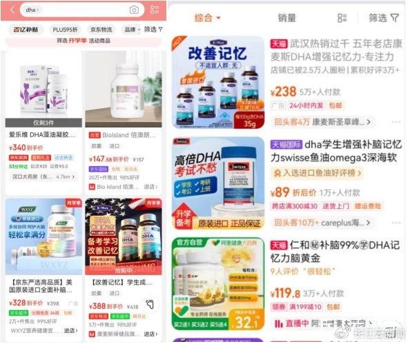 8月25日上午11点长江云新闻记者从淘宝、天猫、京东等网购平台了解到,部分产品都标注了“抢购中”的字样,销量大增。京东某家经营DHA相关产品的客服告诉记者,从昨天到今天,DHA产品的销量差不多达到了一个月的水平。记者注意到,相关DHA产品的销售价格大部分在100-500元/瓶不等,没有出现大面积涨价的情况。