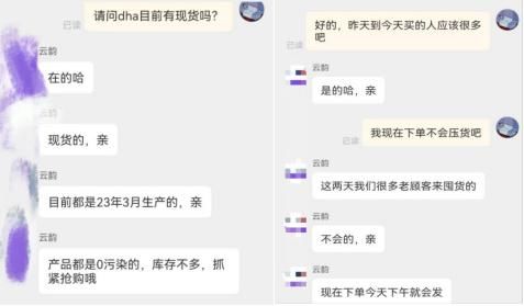 淘宝某DHA品牌客服告诉记者,目前该品牌销售的产品都是今年3月前生产的,这两天下单的大部分都是老客户囤货,目前现货很充足,能够直接发出。
