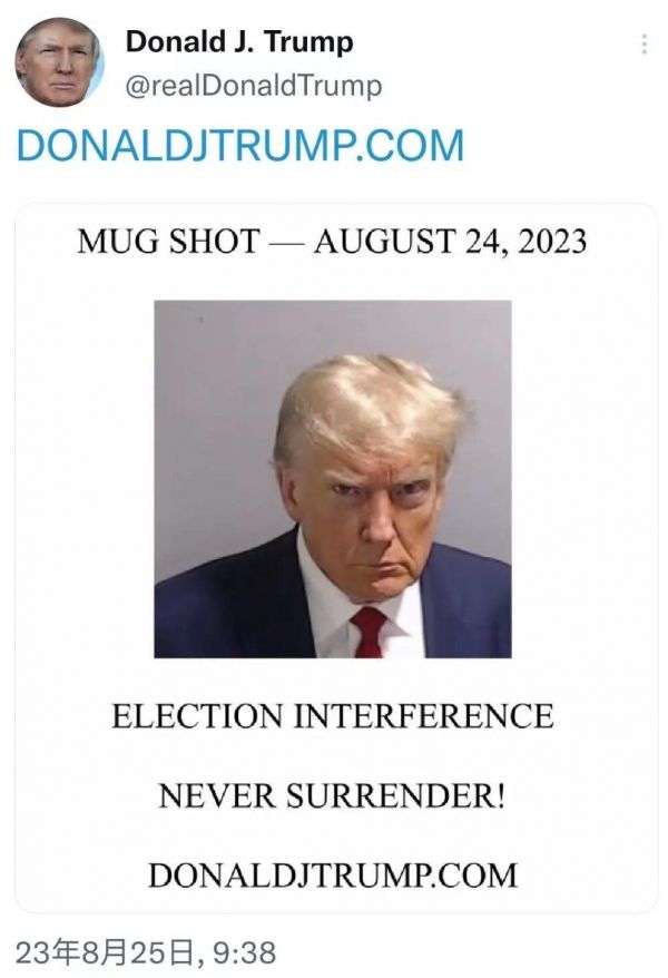 这是特朗普卸任后面临的第四次刑事指控,他选择了在24日晚“黄金时段”自首,赚足了媒体流量。与前三次不同,这次特朗普拍摄了嫌犯“大头照”(mug shot),但他不以为然,甚至主动到已经两年没发过内容的推特(现X平台)上分享自己的照片,发出“永不投降”的呼声。一场政治真人秀的意味十足。