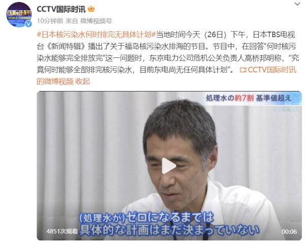 当地时间8月26日下午,日本TBS电视台《新闻特辑》播出了关于福岛核污染水排海的节目。节目中,在回答“何时核污染水能够完全排放完”这一问题时,东京电力公司危机公关负责人高桥邦明称,“究竟何时能够全部排完核污染水,目前东电尚无任何具体计划”。