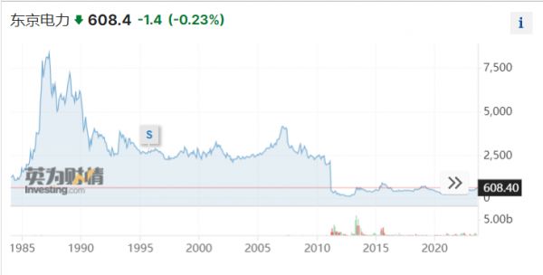 1987年,东电公司曾是全球市值第三的企业,股价最高曾达到8424日元/股。当时,和索尼、丰田一起,该公司被归入20世纪80年代的“抄底美国者”之列。2011年初,该公司股价稳定在2026日元/股左右,在福岛核泄漏事件发生后,股价一路暴跌。截至8月25日收盘,东电报收608.4日元/股,市值为9747.4亿日元。
