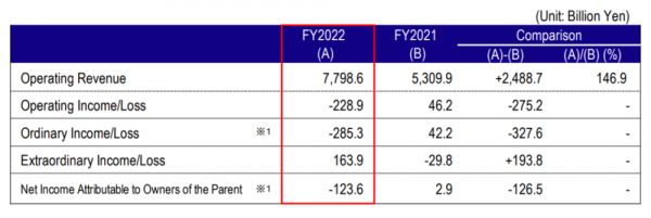据东电发布的2022财年(2022年4月1日至2023年3月31日)财报,报告期内营收约为7.8万亿日元;营业亏损为2289亿日元,去年同期盈利462亿日元。