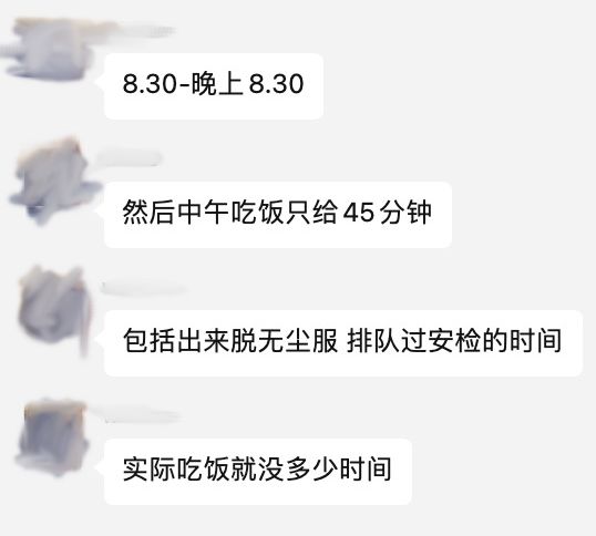 我又问了一位在工厂打工的朋友,他们的吃饭时间有45分钟,但因为要排队、脱无尘服等步骤,实际吃饭时间更少。