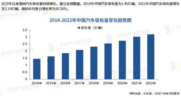 图源:华经产业研究院公安部披露的数据显示,2014年,中国机动车保有量为1.46亿辆,到了2022年,这一数字变为了3.19亿辆,年均复合增长率为10.26%。