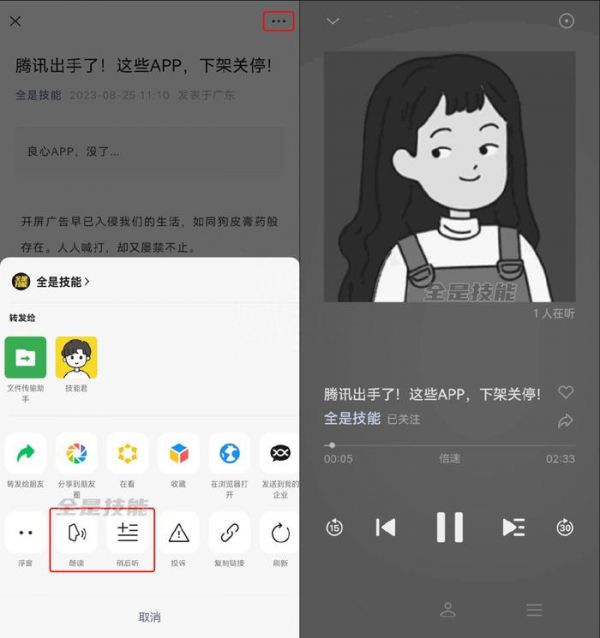 在文章页点击右上角「···」后,新增了「朗读」和「稍后听」功能。