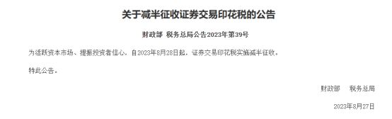 首先是财政部。为活跃资本市场、提振投资者信心,财政部发布消息称,自2023年8月28日起,证券交易印花税实施减半征收。