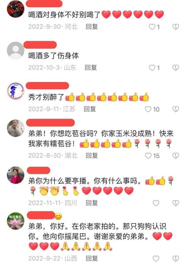 在视频文案中,秀才经常将自己称为弟弟,搭配些语焉不详、情情爱爱的“氛围感文案”,让评论区里的大妈们时常担心他的生活状态。叮嘱他照顾好身体,好好照顾自己的评论比比皆是。
