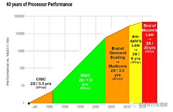 众所周知,CPU的腾飞离不开半导体摩尔定律。根据摩尔定律,半导体工艺特征尺寸每18个月演进一代,同时晶体管的性能也得大幅提升,这就让CPU在摩尔定律的黄金时代(上世纪80年代至本世纪第一个十年)突飞猛进:一方面CPU性能每一年半就迭代一次,推动新的应用出现,另一方面新的应用出现又进一步推动对于CPU性能的需求,这样两者就形成了一个正循环。这样的正循环一直到2010年代,随着摩尔定律逐渐接近物理瓶颈而慢慢消失——我们可以看到,最近10年中,CPU性能增长已经从上世纪8、90年代的15%年复合增长率(即性能每18个月翻倍)到了2015年后的3%年复合增长率(即性能需要20年才翻倍)。