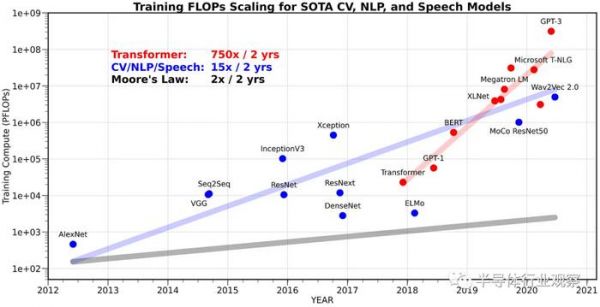 从需求上来说,人工智能确实存在着这样强烈需求。我们可以看到,从2012年(神经网络人工智能复兴怨念开始)到至今,人工智能模型的算力需求确实在指数级增长。2012年到2018年是卷积神经网络最流行的年份,在这段时间里我们看到人工智能模型的算力需求增长大约是每两年15倍。在那个时候,GPU主要负责的是模型训练,而在推理部分GPU的性能一般都是绰绰有余。而从2018年进入以Transformer架构为代表的大模型时代后,人工智能模型对于算力需求的演进速度大幅提升,已经到了每两年750倍的地步。在大模型时代,即使是模型的推理也离不开GPU,甚至单个GPU都未必能满足推理的需求;而训练更是需要数百块GPU才能在合理的时间内完成。这样的性能需求增长速度事实上让GPU大约每两年性能翻倍的速度都相形见拙,事实上目前GPU性能提升速度还是供不应求!因此,如果从需求侧去看,GPU性能指数级增长的曲线预计还会延续很长一段时间,在未来十年内GPU很可能会从CPU那边接过摩尔定律的旗帜,把性能指数级增长的神话续写下去。
